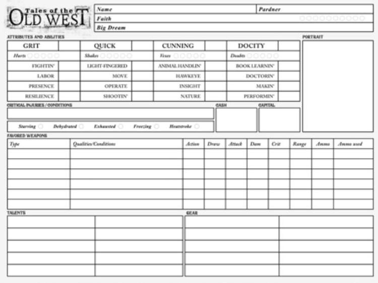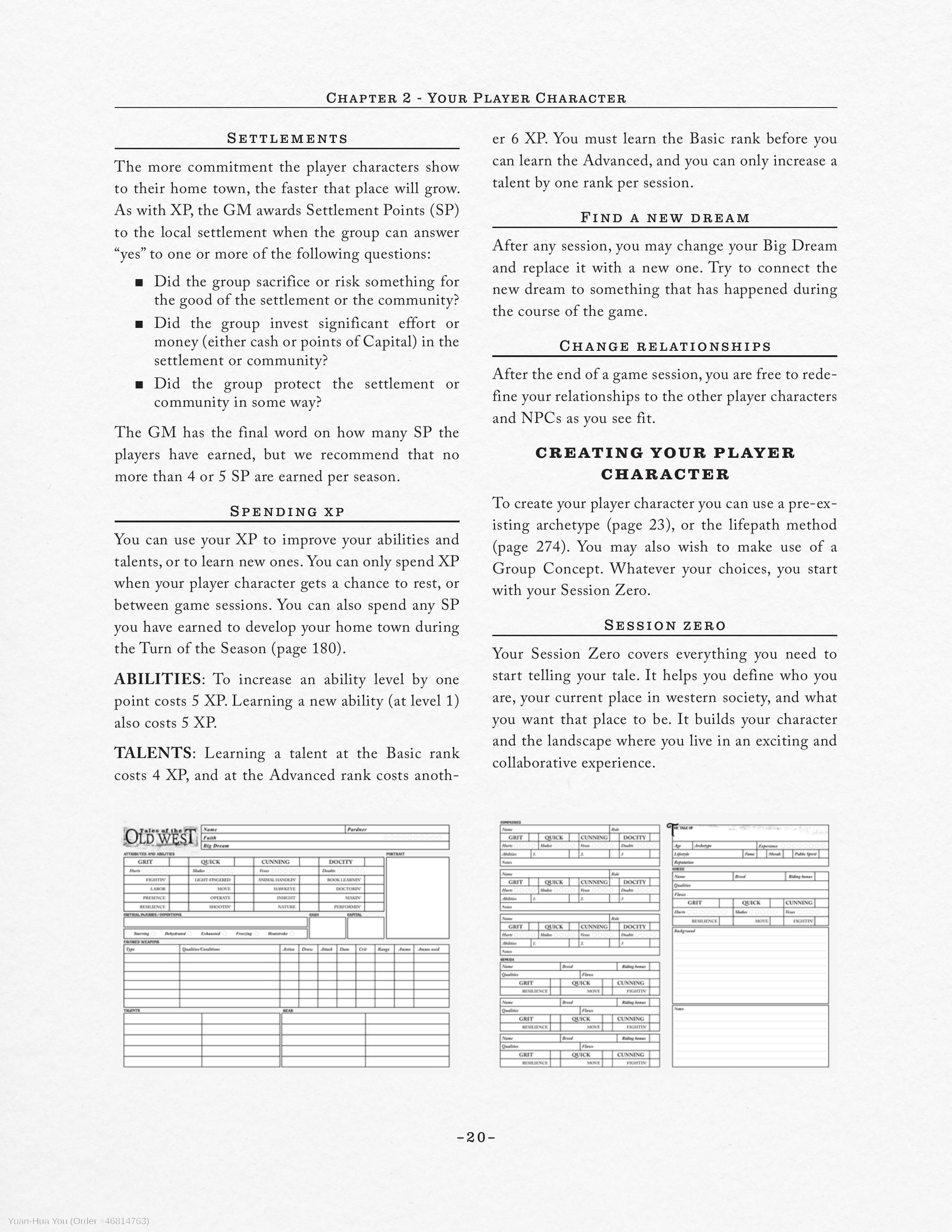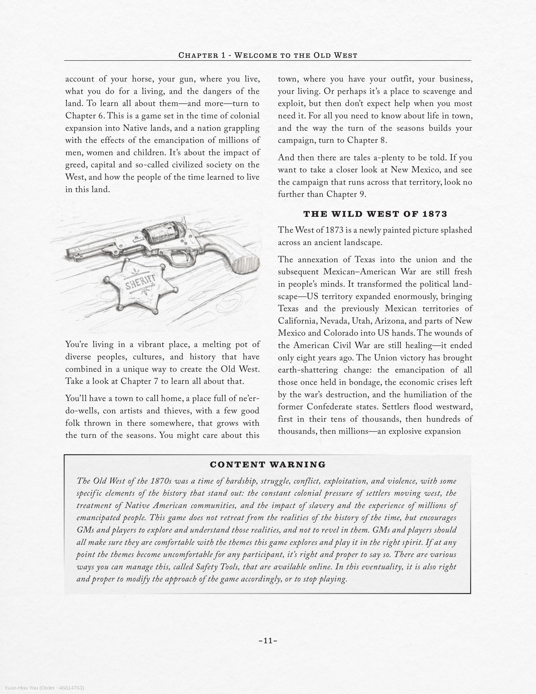 1870 年代的舊西部是一個充滿艱難、掙扎、衝突、剝削和暴力的時代,其中有一些歷史特定元素格外突出:定居者不斷向西推進的殖民壓力、對美洲原住民社群的對待,以及奴隸制度的影響和數百萬解放者的經歷。這款遊戲並不迴避那個時代歷史的現實,而是鼓勵遊戲主持人和玩家探索並理解這些現實,而非沉迷於其中。遊戲主持人和玩家都應確保自己對遊戲探討的主題感到舒適,並以正確的精神來進行遊戲。如果在任何時候,這些主題讓任何參與者感到不適,說出來是正確且合適的。有各種稱為安全工具的方式可以管理這些情況,這些工具可在網路上取得。在這種情況下,調整遊戲方式或停止遊戲也是正確且合適的做法。