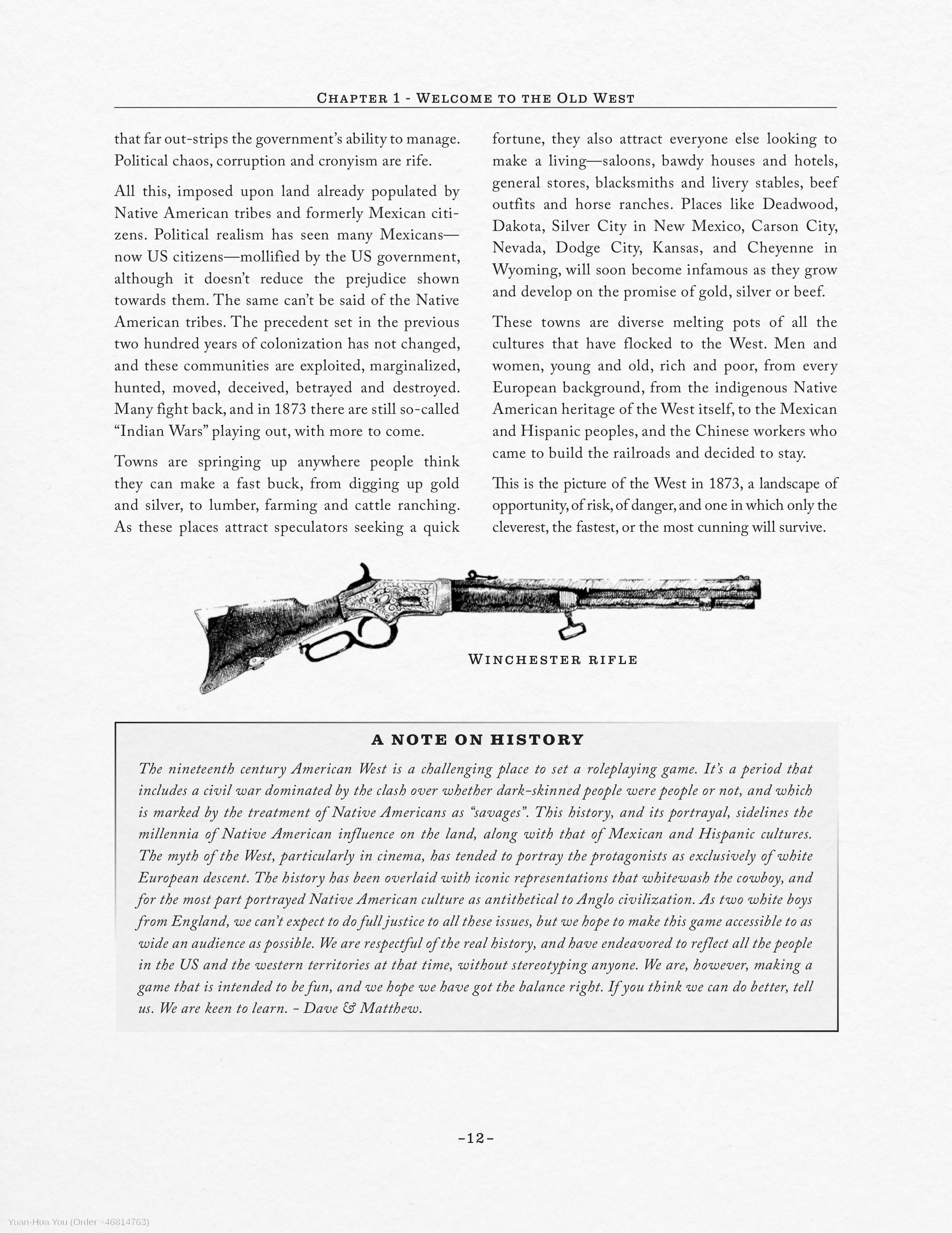 十九世紀的美國西部是一個充滿挑戰的角色扮演遊戲背景。這是一個包括內戰的時期,內戰主要圍繞著深色皮膚的人是否被視為人類的爭論,並且以對美洲原住民作為「野蠻人」的待遇為標誌。這段歷史及其呈現方式,忽略了美洲原住民對這片土地數千年的影響,以及墨西哥和西班牙裔文化的影響。西部的神話,特別是在電影中,往往將主角描繪為純粹的白人歐洲血統。這段歷史被覆蓋上了標誌性的形象,將牛仔美化,而大多數情況下將美洲原住民文化描繪為與盎格魯文明對立。作為兩個來自英格蘭的白人男孩,我們無法完全公正地處理所有這些問題,但我們希望讓這款遊戲能夠被盡可能廣泛的觀眾接受。我們尊重真實的歷史,並努力反映當時美國及西部領土上的所有人群,避免刻板印象。然而,我們製作的是一款旨在帶來樂趣的遊戲,我們希望我們找到了正確的平衡。如果你認為我們可以做得更好,請告訴我們。我們渴望學習。-DaveE®Matthew。