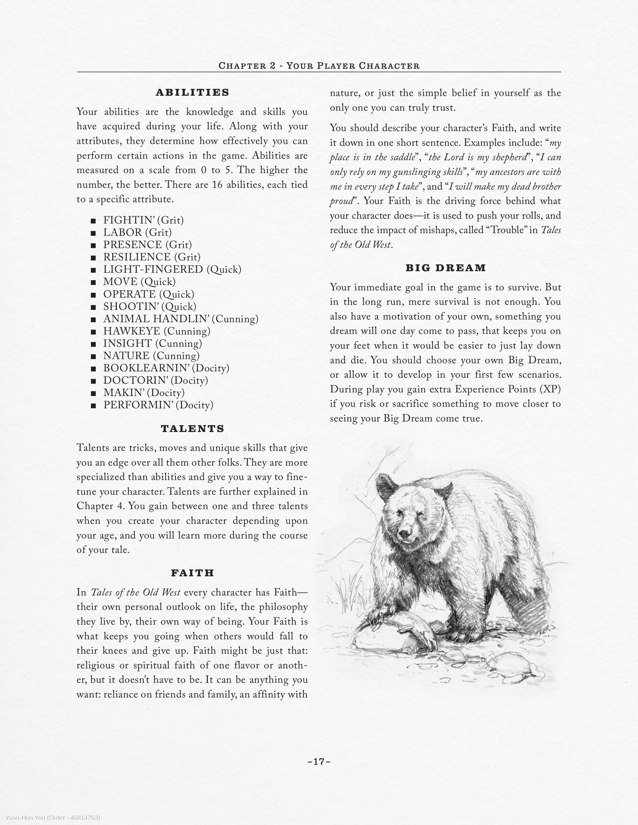 在這片充滿原始機會的土地上,沒有什麼能限制你成為什麼——無論是種族、性別,還是你口袋裡有多少錢都無所謂。你來自何方,或過去做過什麼都不重要,你在西部塑造自己,西部也塑造你。沒有怪物,只有其他人,只有死人才會忘記這片土地是你的敵人。每個人都有信念——許多人信仰上帝,但也有人信念靈魂的力量、夥伴的力量,或僅僅信仰自己。你的信念讓你在艱難時刻繼續前行。