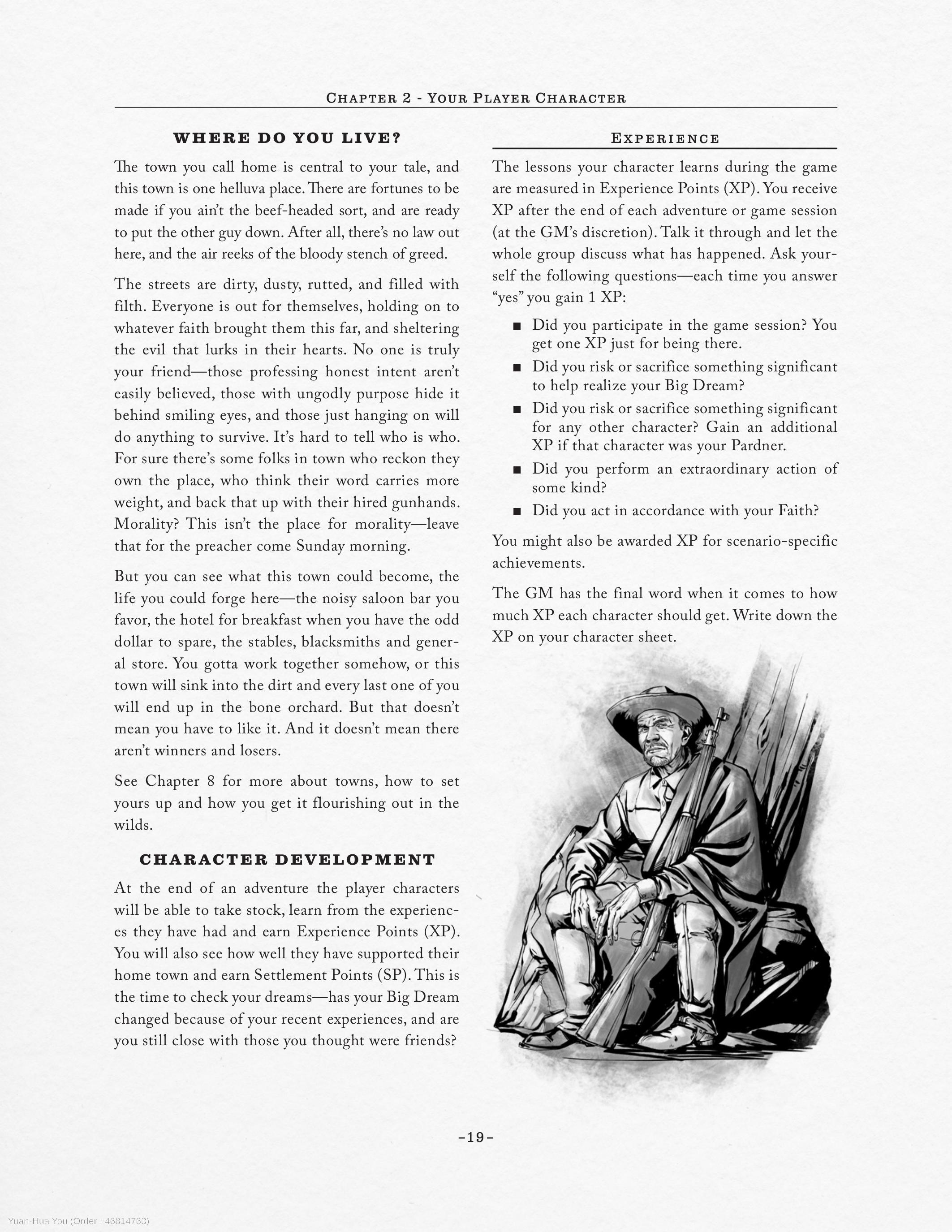 你將擁有一個可以稱之為家的城鎮,一個充滿無賴、騙子和小偷的地方,當中也摻雜著一些好人,隨著季的更迭而成長。你可能會在意這個城鎮,那裡有你的裝備、你的生意、你的生活。或者它可能是一個用來拾荒和剝削的地方,但當你最需要幫助時,別指望有人會伸出援手。關於城鎮生活的一切,以及季更迭如何塑造你的戰役,請參閱第八章。
