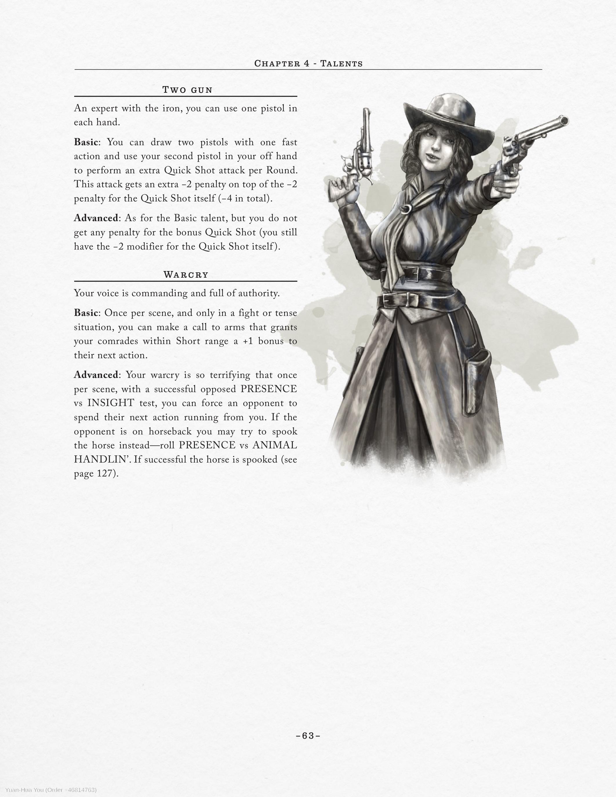 | 4 | 盜牛賊偷走了你的牛群,但你追蹤他們並將牛群帶回。現在當地警長在追捕壞人時會來找你。 | 鷹眼 1、動物馴養 1 | 追捕者或追蹤者 | 溫徹斯特 1866 型 & D6 發射彈藥、雷明頓 1858 型 & 2D6 發射彈藥、平托馬 1D6 |