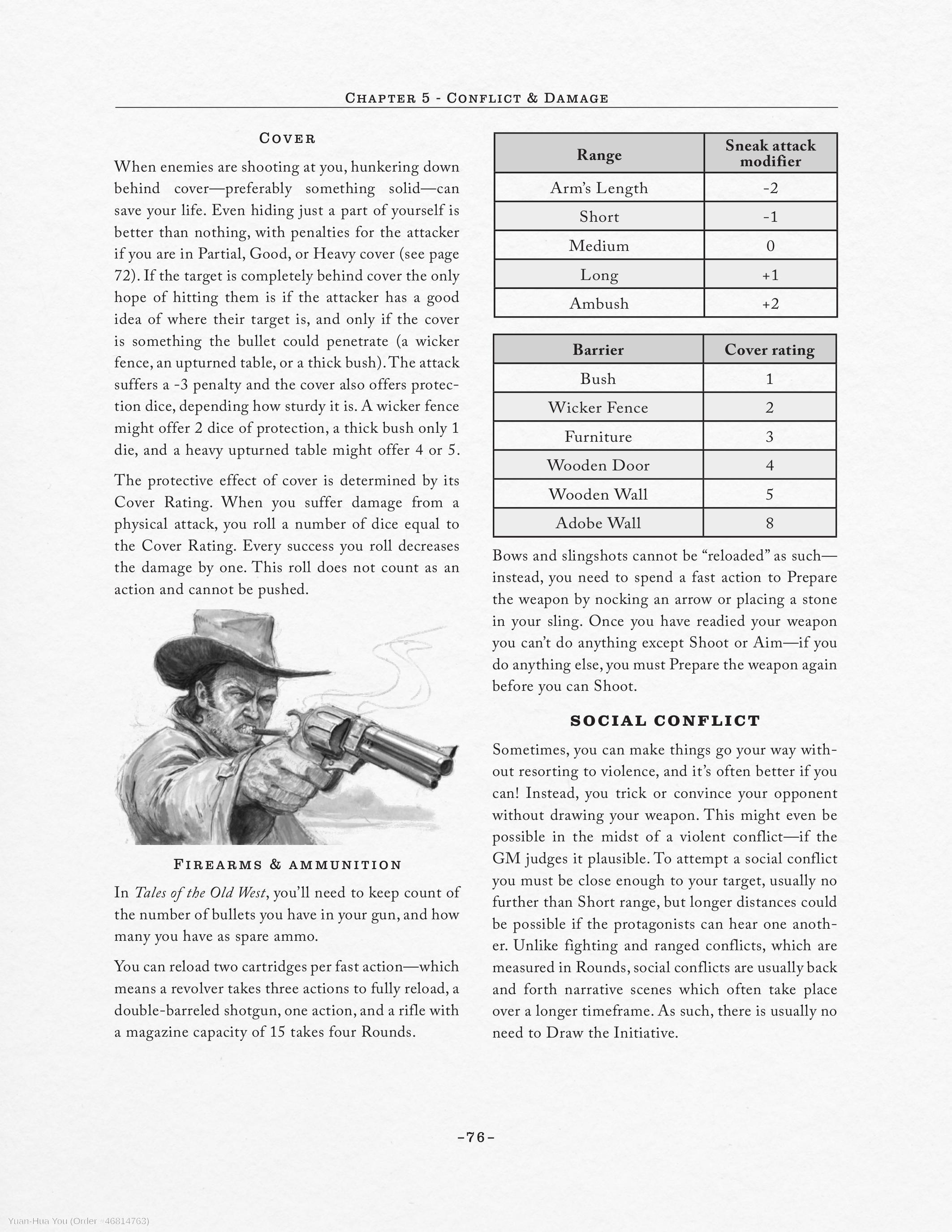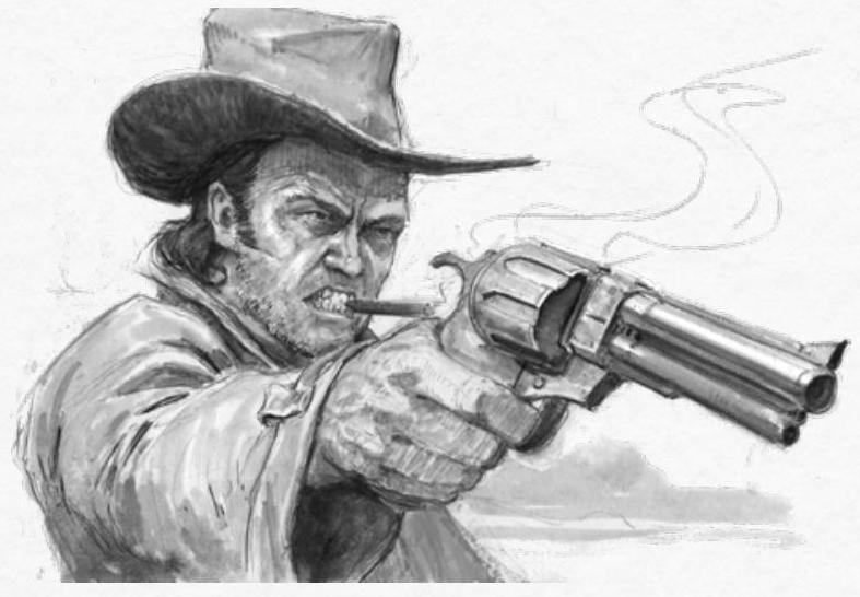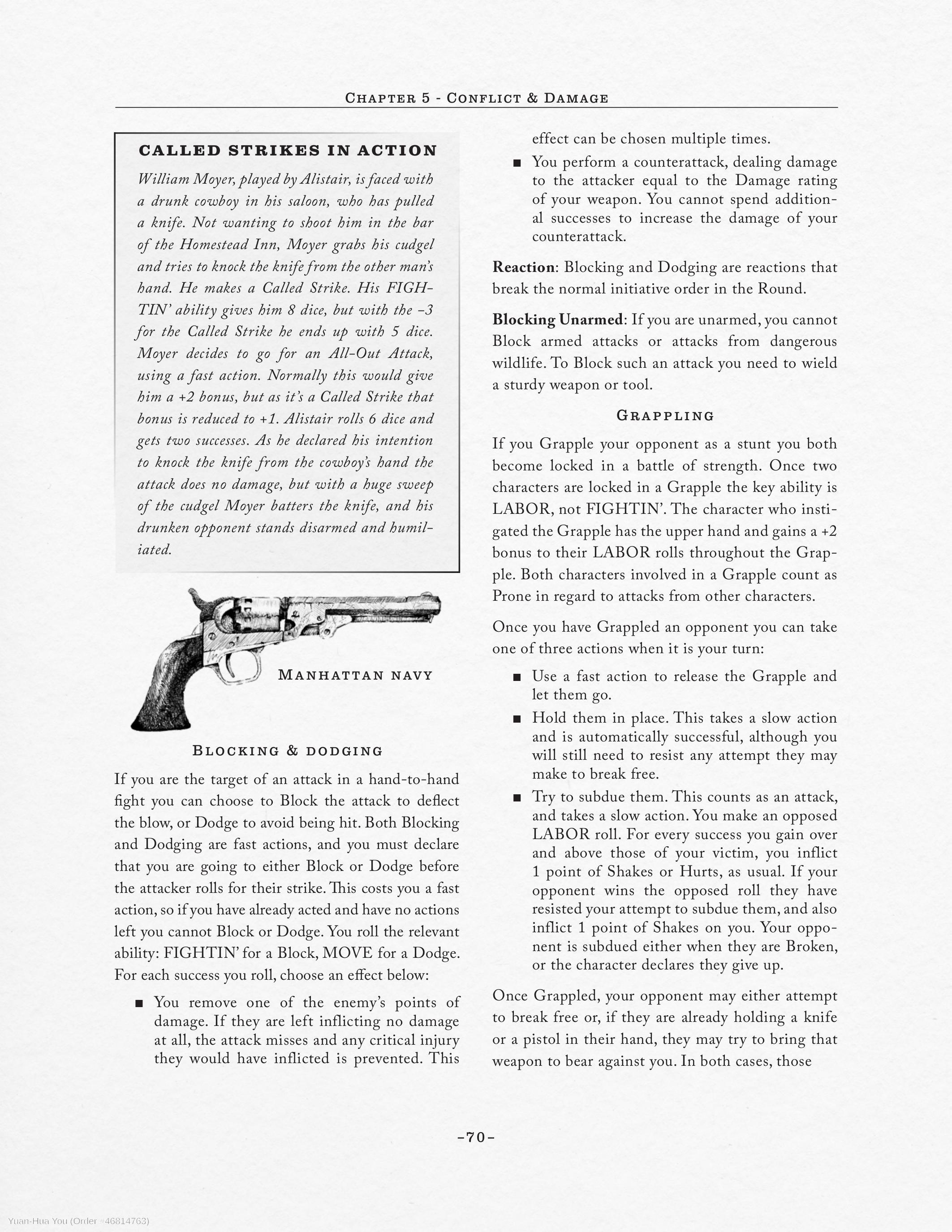 描述你的行動:當輪到你行動時,只需說明你想執行的兩個動作,描述你如何進行,然後擲骰以判定是否成功。有些動作會讓你的對手有機會執行反應。在這款西部主題的遊戲中,需特別注意你所使用的武器種類。在射擊前,拉動單動作左輪手槍的槍機和拉弓箭都需要一個快動作。拉動槓桿式步槍的槍機並裝填新彈藥也需要一個快動作。一般射擊需要一個慢動作。快速射擊可作為快動作,但會有 -2 的懲罰。瞄準射擊或在近戰攻擊中付出額外努力也需要一個快動作,並可獲得 +2 的加值。