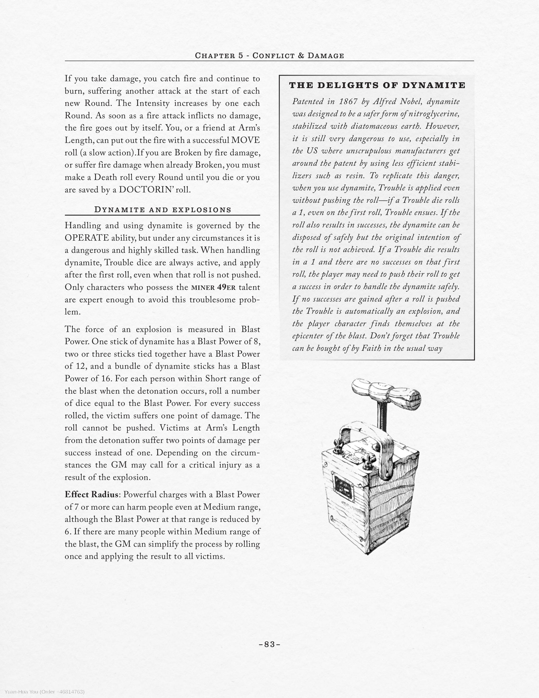 1867 年由阿爾弗雷德・諾貝爾申請專利的炸藥,是為了成為一種更安全的硝化甘油形式,並以矽藻土穩定。然而,它仍然非常危險,尤其是在美國,不良製造商會使用樹脂等效率較低的穩定劑來規避專利。為了模擬這種危險,當你使用炸藥時,即使不強推擲骰,麻煩也會被施加——如果麻煩骰擲出 1,即使是在第一次擲骰時,也會引發麻煩。如果擲骰同時有成功,炸藥可以安全處理,但原本擲骰的目的無法達成。如果麻煩骰擲出 1 且第一次擲骰沒有成功,玩家可能需要強推擲骰以獲得成功,才能安全處理炸藥。如果強推擲骰後仍未獲得成功,麻煩將自動變成爆炸,玩家角色將處於爆炸中心。別忘了,麻煩可以像平常一樣用信仰來抵消。