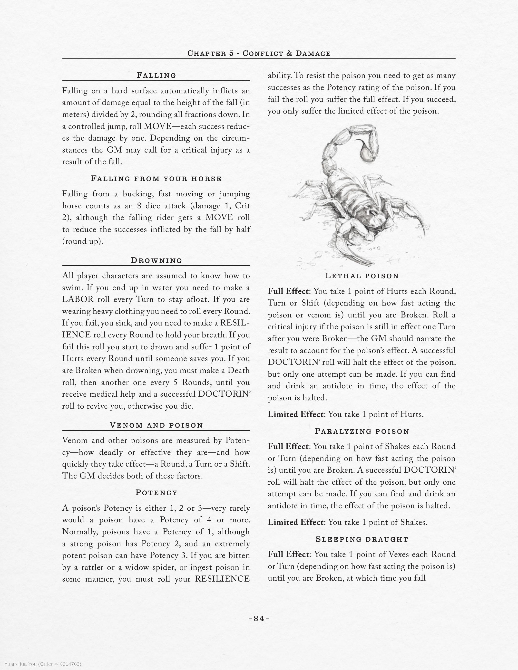 所有玩家角色都假定會游泳。如果你落入水中,每個回合都需要進行一次勞動擲骰以保持漂浮。如果你穿著厚重的衣物,則需要每輪擲骰。如果失敗,你會下沉,並且每輪都需要進行一次韌性擲骰以屏住呼吸。如果這次擲骰失敗,你開始溺水,每輪受到 1 點傷害,直到有人救你。如果你在溺水時處於破碎狀態,你必須進行一次死亡擲骰,之後每 5 輪再擲一次,直到你接受醫術救助並成功進行醫術擲骰復活,否則你會死亡。