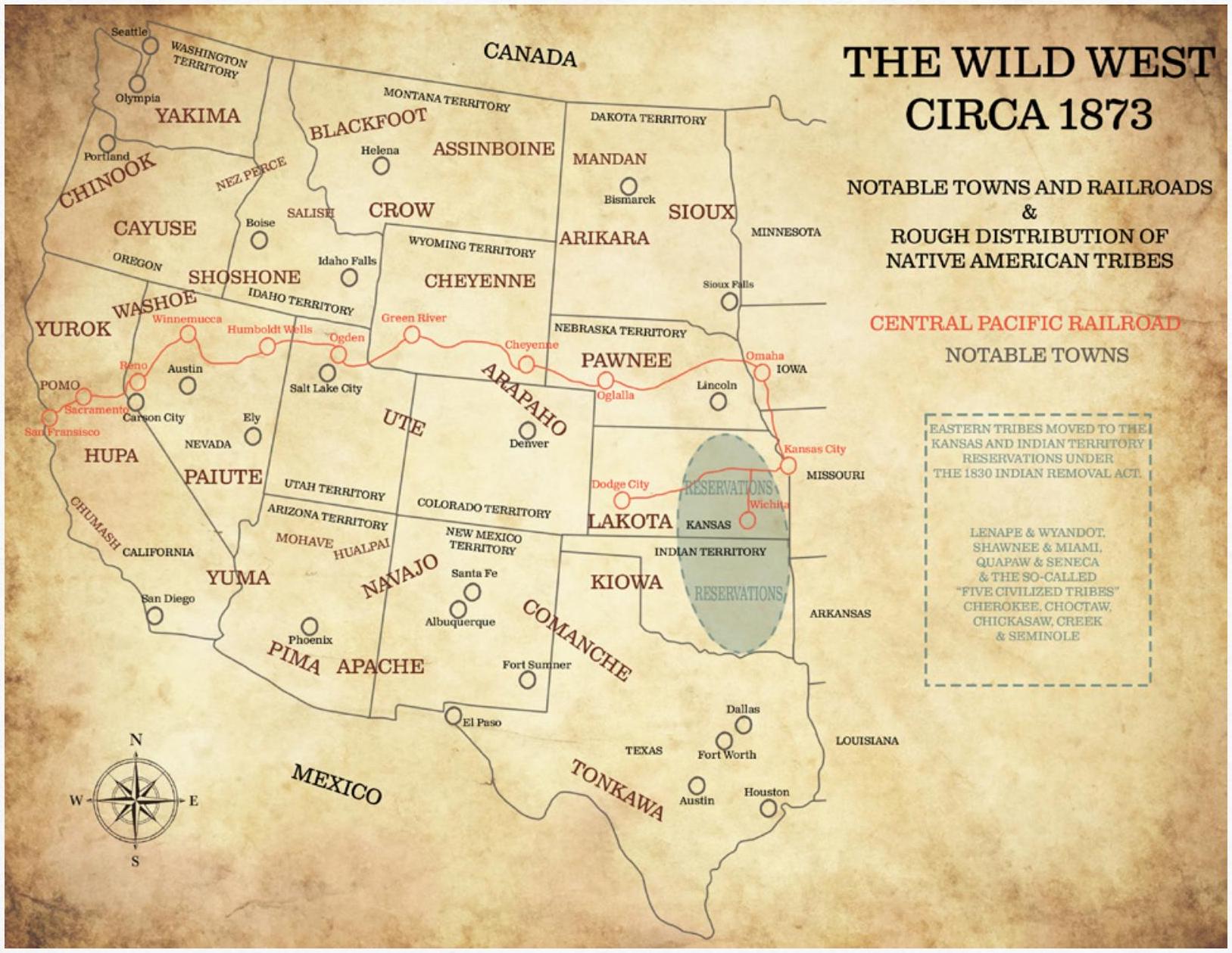 到了 1870 年,許多東部部落已被摧毀、強制遷移 (常被遷至其他未經諮詢的美洲原住民族部落土地)、忽視、視為敵人,或被迫同化,這一切都是為了容納不斷湧入的歐洲移民。許多所謂的「印第安戰爭」已經或正在進行中,部落們拼命保護他們的生活方式:科羅拉多和懷俄明領地的夏安族和阿拉帕霍族;德州、新墨西哥和亞利桑那的科曼奇族、納瓦霍族和阿帕奇族;以及北方平原的蘇族等。到了這個時候,美洲原住民族對歐洲移民的虛偽和真實意圖已不抱幻想,而移民們也清楚危險且絕望的原住民可能帶來的威脅,儘管對威脅的恐懼往往超過了威脅本身。但 1870 年代西部的現實遠比這更複雜。許多部落,這些部落是現在與美國陸軍交戰部落的傳統敵人,提供偵察兵和士兵與美國人合作。其他原住民則與移民共處,擔任牛仔和牧場工人。然而,對大多數人來說,他們只能在那些「慷慨」提供給他們的保留地上盡力生存。