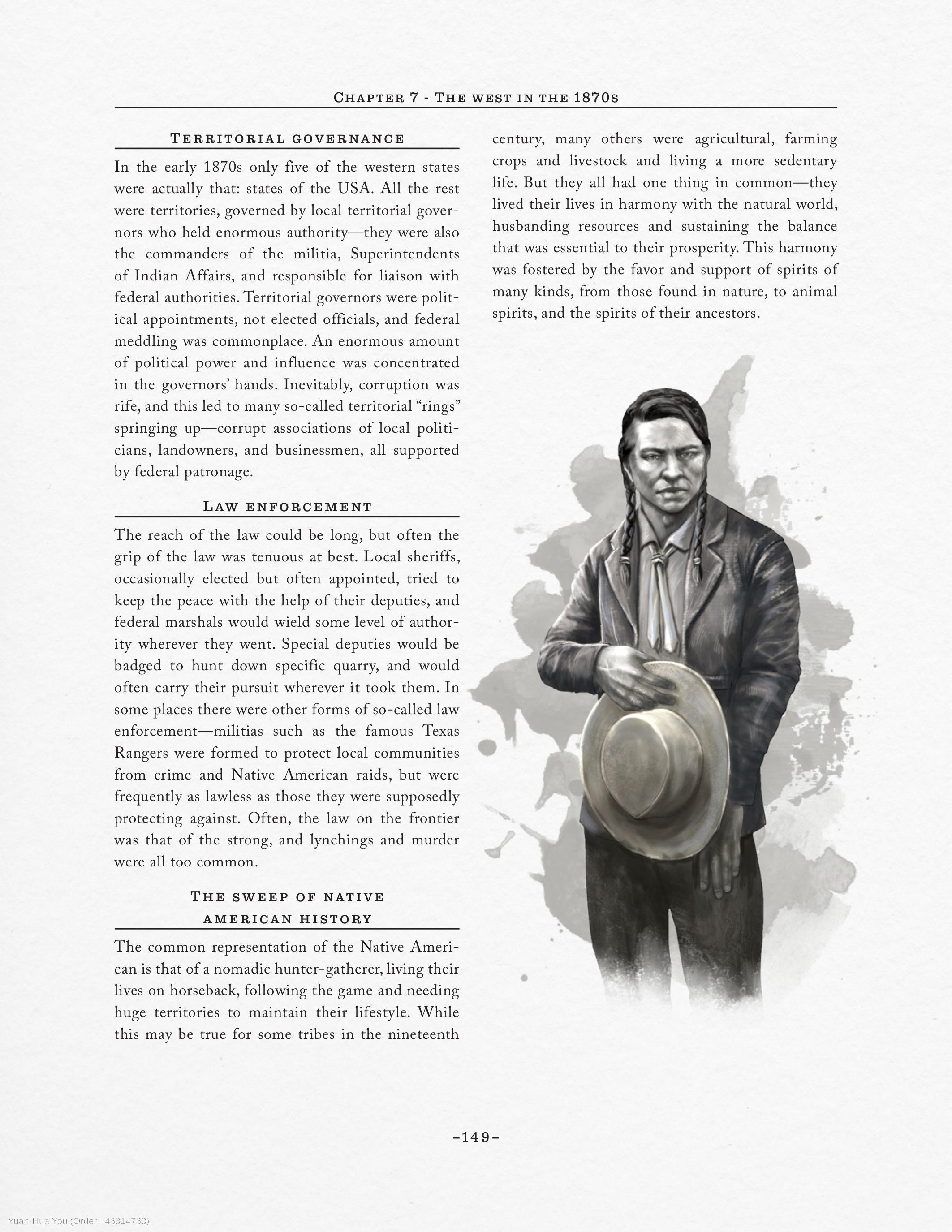 在《舊西部傳奇》中,我們希望所有這些歷史都能被認識。你如何在你的劇本中演繹這段歷史由你決定,但我們認為,越是將 1870 年代西部真實歷史生活中錯綜複雜且激動人心的細節融入其中,你的遊戲就會越加豐富且有趣。
