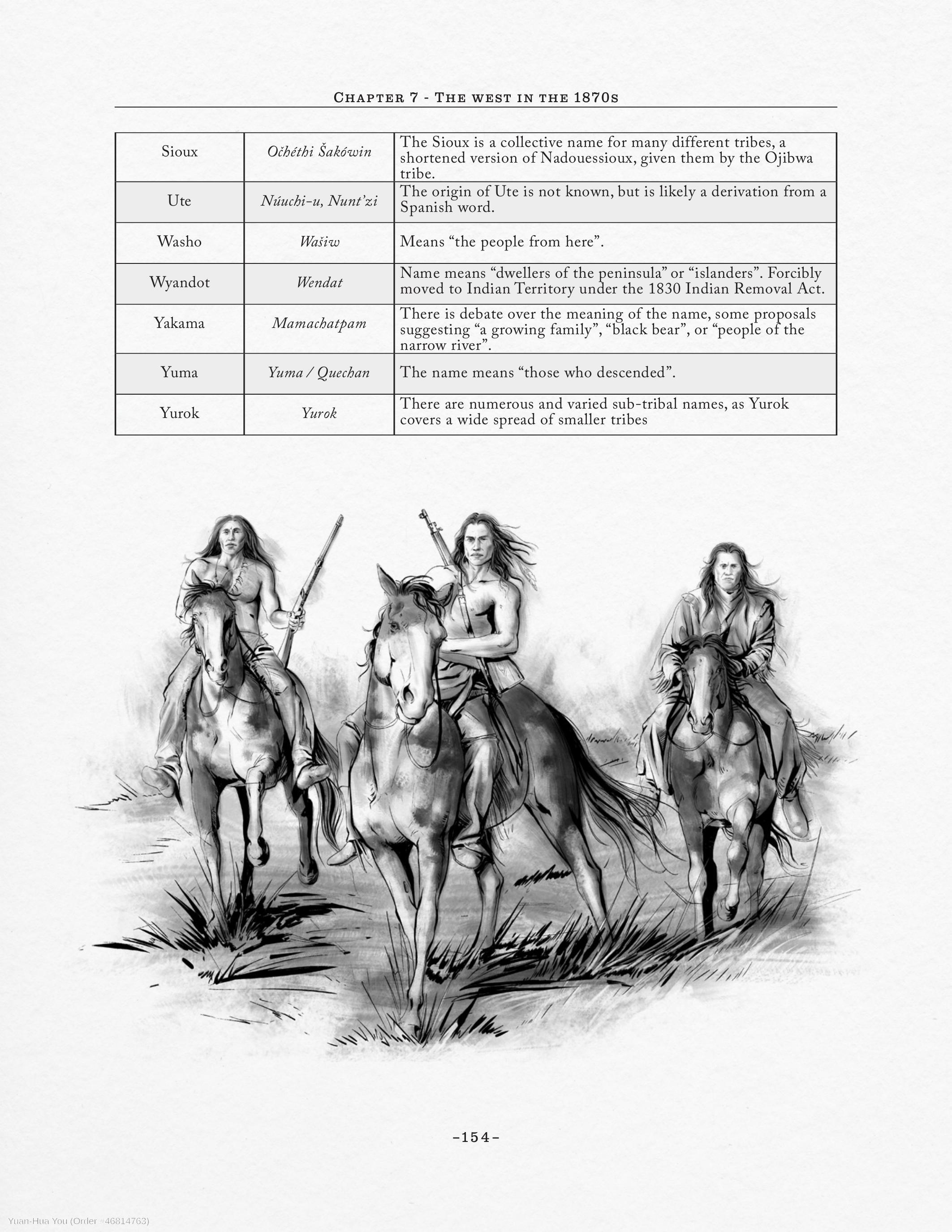 為了讓最廣泛的遊戲社群能夠輕鬆熟悉並接觸,我們在《舊西部傳奇》中一般採用現代部落名稱,但盡可能使用廣為接受的原住民拼寫。我們也彙整了一份自稱名稱清單,並附上一些相關註解。其中有些來源較為確定,有些則較具推測性或開放解釋與討論。但無論如何,我們希望您覺得這些資訊有用,並希望您能用它來創造包含美洲原住民經驗的引人入勝故事,並激發您進一步了解當時真實歷史的興趣。